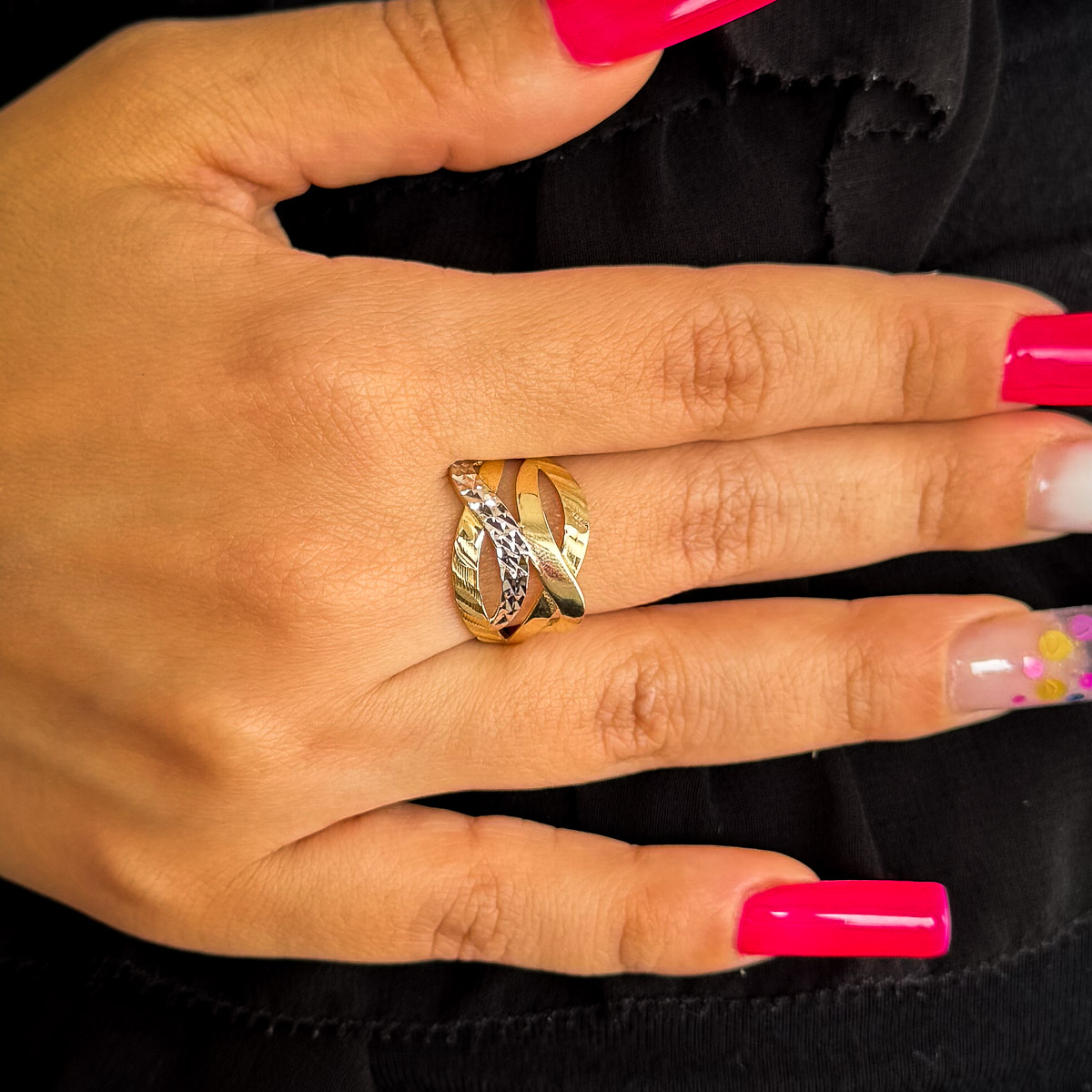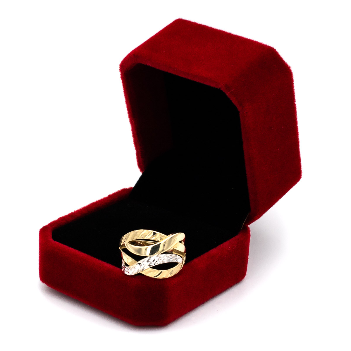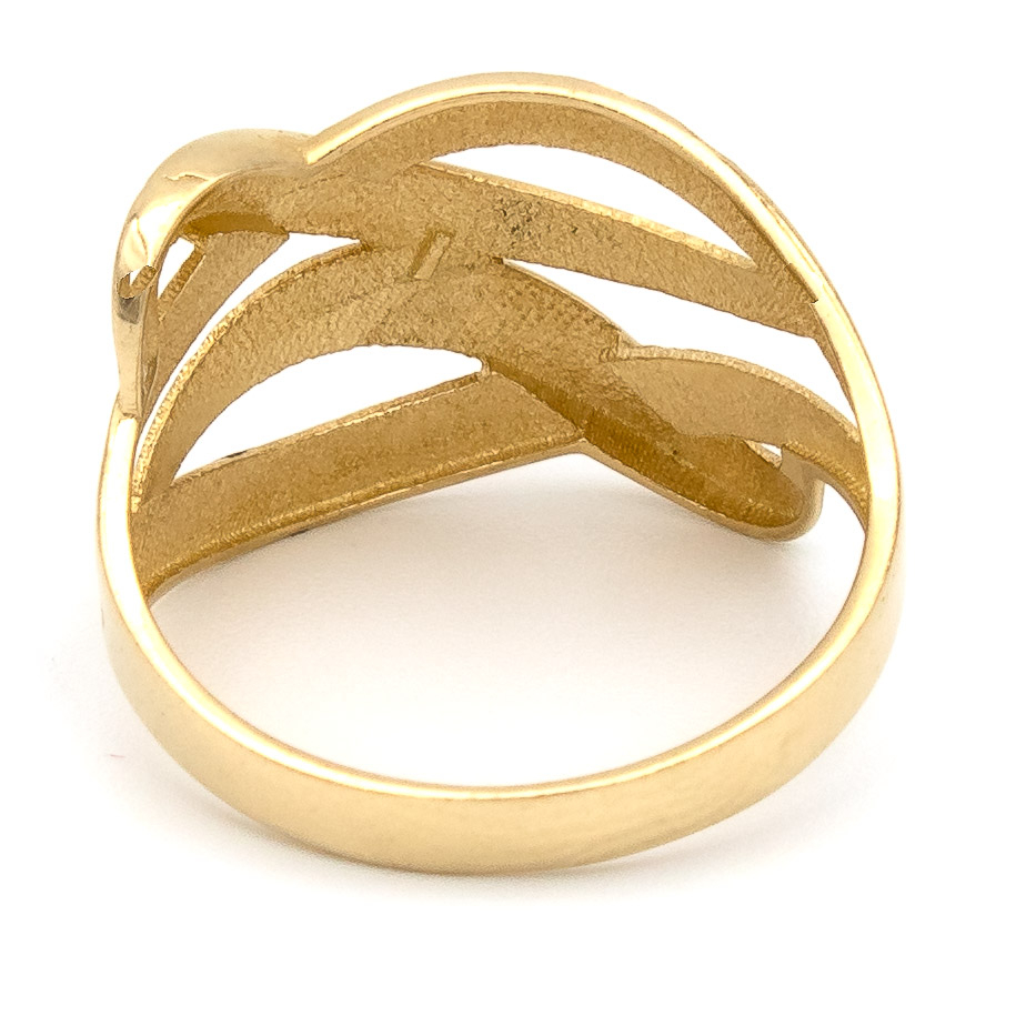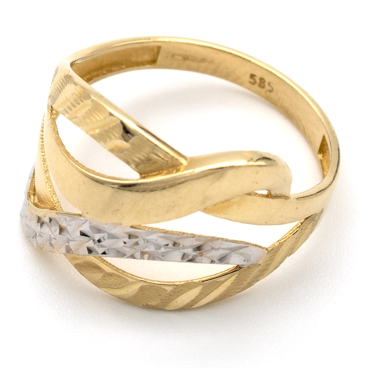 Inelul cu linii suprapuse din aur galben și alb 14K este despre armonie – între contrast și echilibru, între clasic și contemporan.